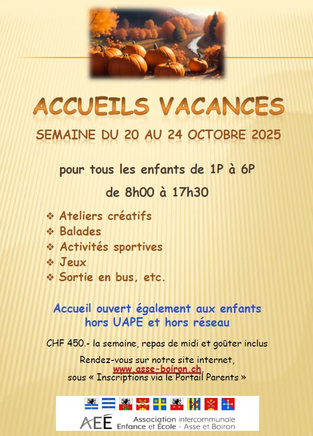Nous vous relayons la communication de l'AEE concernant l'Accueil Vacances pour octobre.